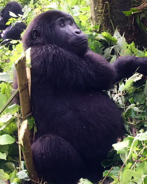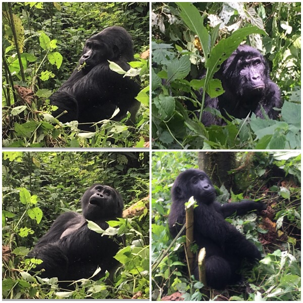 I början följde vi en led uppåt men snart vek vi av och trampade igenom lera o tät djungel upp över huvudet i hög stigning, stekande solsken och oväntat högt tempo. Guiden använde en machete (osäker stavning) för att röja vägen och vi svettades o flåsade rejält i 2 timmar innan en liten gorillaunge satt 3 meter framför oss. Guiderna fick hjälpa oss trampa runt i den svåra terrängen medan gorillorna sakta rörde sig o vi sakta följde efter. Helt obeskrivligt när den stora 40-åriga dominanta silverhåriga hannen sedan dök upp, tuggandes och fisandes och helt ignorerade vår närvaro.