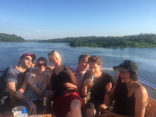 En härlig hippie-ö helt enkelt med många små smultron-ställen med kuddar, hängmattor, enkla toaletter och inte fler besökare än vi och max 10 till. Natten fylldes dock av blixtrar, dunder och en riktigt djungelstorm, ganska häftigt ändå. Dagen efter valde vi extreme river rafting vilket innebar jag o Peder i en liten långsmal båt med varsin paddel genom forsarna. Dessutom testade vi riverboarding och tog oss igenom forsar, strömmar o vågor med en bräda och ett par simfötter. Det ska väl erkännas att jag var lite rädd i början för det är inte några små forsar och vi hamnade sjukt mycket under ytan utan sikt men vi klarade oss ändå förvånansvärt bra, en adrenalinkick utöver det vanliga helt klart. När vi kom tillbaka till vårt nya camp i Jinja uppe på en kulle med utsikt över Nilen tog hela gruppen en sunset Cruise där vi var ensamma med personal på en 2-våningsbåt med fri bar, musik och mat.