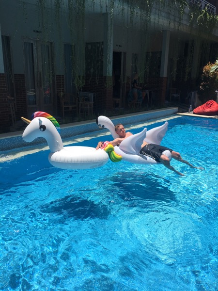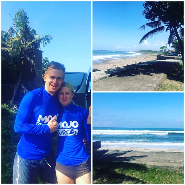 Dagen efter hölls vår andra surflektion på en ny strand där det var grundare och vi kunde öva fler gånger på att komma upp på fötterna och mindre paddling. Efteråt fick jag skavsår på låren och armarna av friktionen men Peder klarade sig bättre. Efter varje lektion får vi se bilder som en fotograf tar så vi kan se hur vi utvecklas (eller inte utvecklas)… vi ska helt klart köpa våra bilder efter surfresan som är på G. Lunch och middag åt vi tillsammans med det gäng vi ska göra 5 dagars surfresa med. De verkar trevliga, de flesta från Australien och någon från UK. Imorgon åker vi speedbåt till Lombok för att surfa på ett rev och inför det hölls det lite eftermiddagslektion och teori i poolen hemma på hostelet. Ska bli riktigt kul att se fler delar av Indonesien. Nu känner vi oss lite färdiga med Cangu. Tydligen är det biokväll på hostelet ikväll, ska bli skönt. Vi blir trötta av värmen men sååå skönt, semestern börjar kännas på riktigt nu.