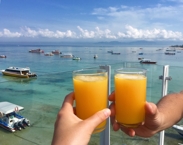 Dagen efter hann vi med en morgonsurf igen innan vi reste vidare till ön Nusa Lembongan. Innan båten gick väntade vi i hamnen där jag och Peder testade lokal snabbmat som var galet stark och därmed fick sköljas ner med vatten och chips.. Båtresan blev sedan lite fördröjd pga en passagerare för mycket och det var alldeles för lite fläktar inne båten så jag och några till satte hos på taket, kanske något skumpigare men häftigt och grymt skönt med lite fläkt. Vårt hotell ligger precis intill stranden i en sluttning och min och Peders lilla men underbart fräscha stuga ligger givetvis högst upp. Poolen och restaurangen/baren ligger galet bra placerat med utsikt över havet och stranden. Inget att klaga på helt enkelt.