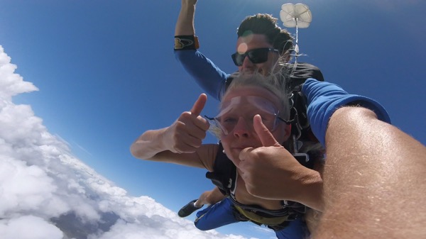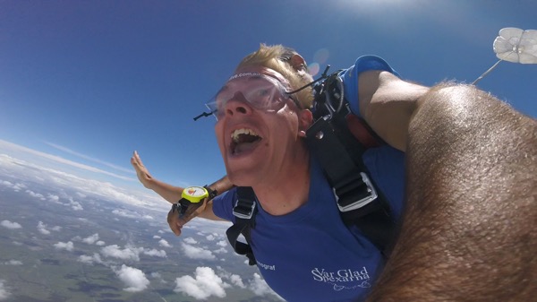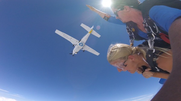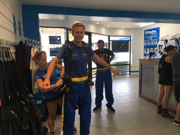 Efter båtresan hade vi en heldag i Airlie beach innan bussen går vidare söderut nu kl 21. Först var vi taggade på en krokodilsafari men sedan hängde det såklart massa flyers för skydiving överallt och plötsligt hade vi bokat ett tandem-hopp på 15 000 ft eller kanske snarare 4,5 kilometers höjd. Peder var inte lika förtjust som jag men vi bestämde båda att det var något vi ville ha gjort. En bucketlist helt enkelt. Vi åt en stadig och utomordentlig frukost på cafet med den snabba internetuppkopplingen och sedan degade vi lite vid poolen vid havet innan det var dags att checka in och testa utrustning inför hoppet. När vi satt i bussen på väg till flygplatsen började nervositeten på riktigt. Hur kommer man ens på idén att hoppa ut ifrån ett fullt fungerade flygplan ovanför molnen..