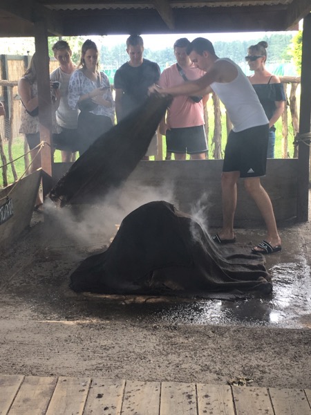 Vi delade rum med två jämngamla trevliga tjejer från Österrike. Endast vår buss bodde där och stället drevs av en familj som även gjorde en traditionell maorisk festmåltid tillagad flera timmar under en grushög i marken.