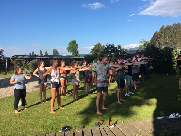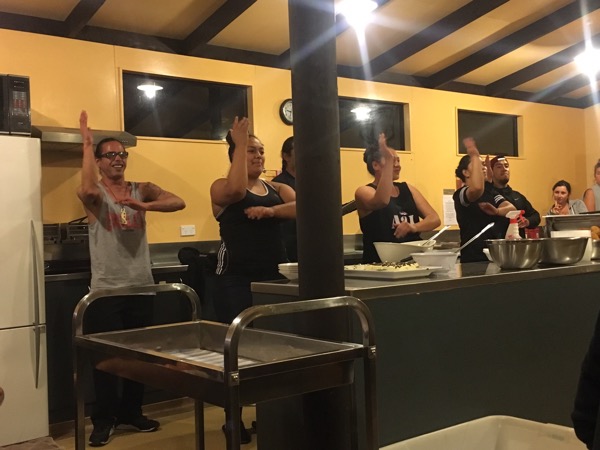 Sedan umgicks vi bara med alla andra innan det var dags för den fantastiska middagen bestående av olika sorters kött och den lokalt viktiga ålen, det klassiskt friterade brödet samt potatis, grönsaker, sallad osv. Supergott och supermycket mat. Efter efterrätten underhölls vi av unga Maori-artister som sjöng, dansade och visade oss några grundläggande rörelser. Riktigt grymma musiker som bara sprudlade av energi och kulturell stolthet.