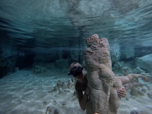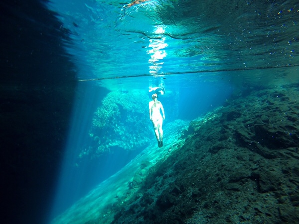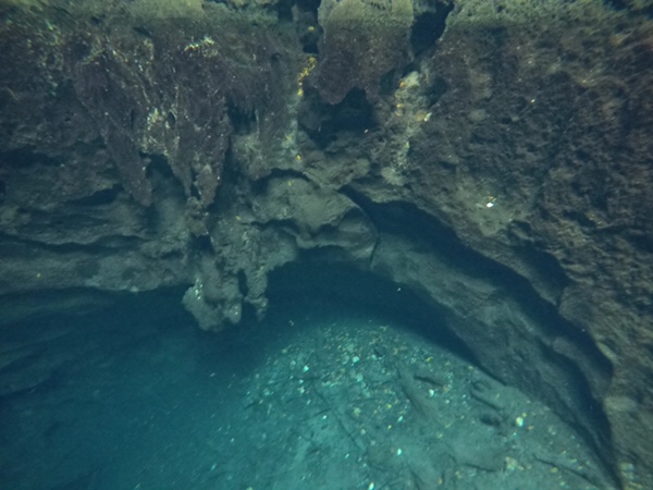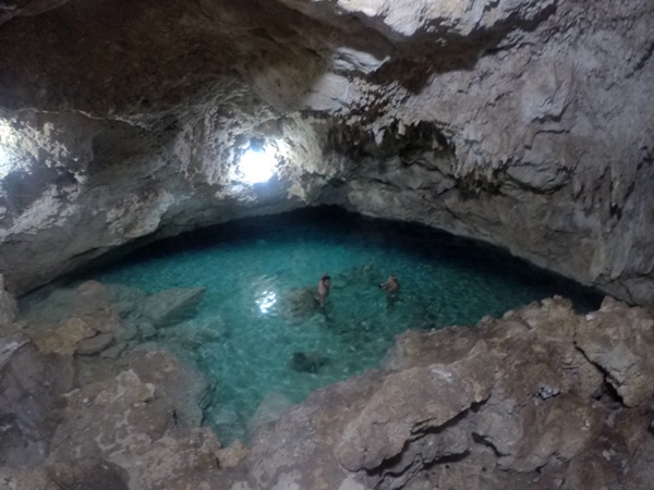 En söt svart liten fisk med spröt lever i grottan men annars var den tom och det kändes sjukligt exklusivt att få simma runt i det varma klara vattnet medan Gustavo berättade allt vi behövde veta och lite till.
