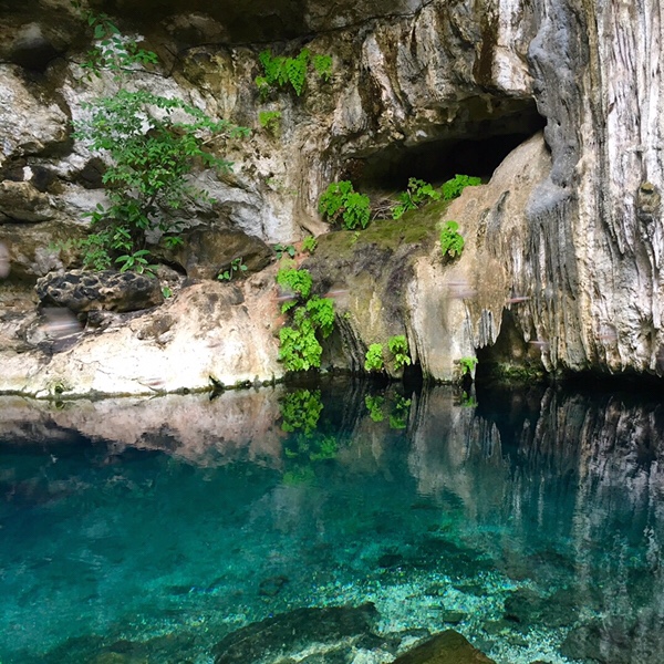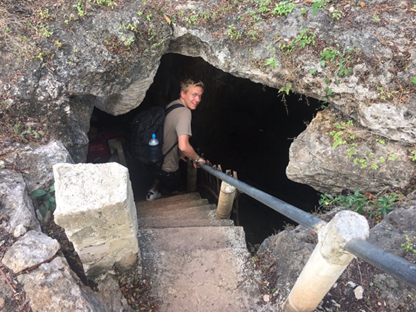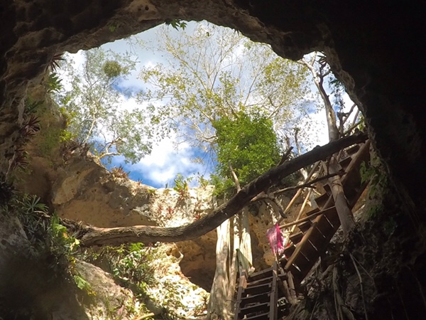 Lite läskigt att titta ner under ytan vid kanten där det blev djupt och mörkt dock. Snart skulle vi vidare till cenote nr 2 vid namn Yaxbacaltunn, även den privatägd av några familjer en bit bort. Familjen på plats ägde även en del djur inklusive kaniner, ankor och en liten krokodil. Även denna gång följde vi en trappa ner men denna gång i en mer öppen grotta och så fort vi klev ner började grottans fåglar cirkulera runt, men de flög aldrig ut.