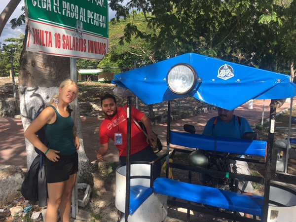 Han tog oss till den lokala busshållplatsen efter att längs med vägen berättat både det ena och det andra. Tillsamman med ca 10 lokalbor åkte vi en timme ut till den lilla orten Homun med ca 5000 invånare. Där träffade vi vår förare som körde oss runt hela dagen på en blandning mellan en flakmoppe och en thailändsk ”tuktuk”. Först åkte vi ut till några familjers privatägda Cenote (undervattensgrotta) vid namn Pool huinic. Först visade Gustavo oss en mängd lokala träd och växter sedan gick vi ner längs en trappa i ett hål i marken.