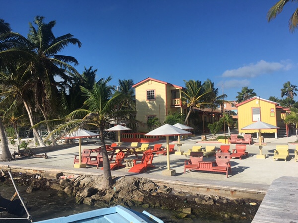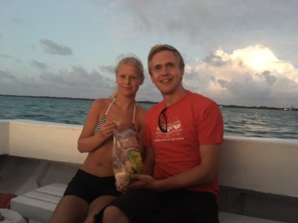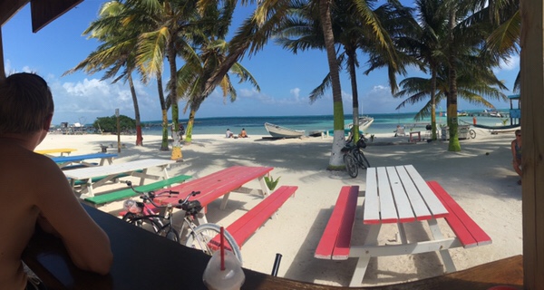 Resan från Tulum i Mexico till den lilla ön Caye Caulker i Belize tog oss i princip en dag. Precis innan vi skulle passera den officiella marina tullen ut ur Mexico i staden Chetumal behövde Peder (han är tyvärr snabbare än mig) springa runt i värmen i sista sekund och leta bankomat pga att de inte accepterade betalkort för utreseavgiften (och för att de 5 tidigare bankomaterna antingen var trasiga/inte fick kontakt. Sedan att vissa inte verkar behöva betala utreseavgift och att denna dessutom kan variera är en helt annan sak. Men det gick bra tillslut och den 90 min skumpiga båtresan (som skulle avgå ”någon gång mellan kl 15-17”) över till San Pedro var kanske inte nödvändigtvis den roligaste vi gjort. Men det mest intressanta var nog den ”halvtimmes” långa båtresan över till ön Caye Caulker från tullen i San Pedro (Belize). Vi var kanske 20 reströtta personer i båten som vid det laget höll tummarna att den stackars båtmotorn skulle orka fram. Vid ett tillfälle stannade den helt och vid det laget var det bäcksvart och en annan liten båt kom då förbi en stund av oklar anledning. Motorn kämpade men en timme senare vid ca 19-tiden var vi iaf framme tillslut och vi åt en god middag på Happy Lobster på öns huvudgata. Hotellet var extremt över förväntan ändå. Det här är till exempel utsikten från vårt rum.Vi hade ett stort fint rum (med två dubbelsängar) på andra våningen i ett fräscht gult hus precis vid strandkanten intill hotellets privata strand och brygga. Från balkongen kan jag nästan nå till kokosnötterna i en palm.