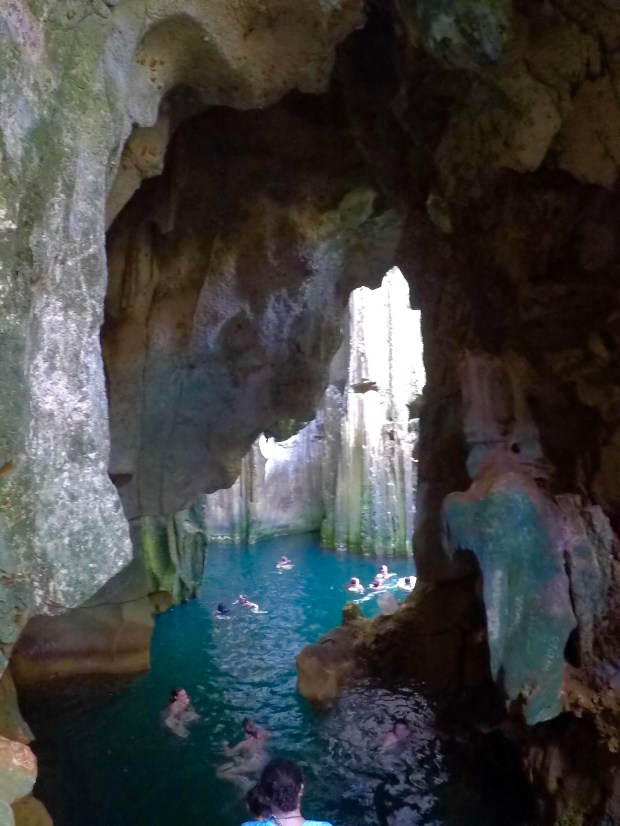 Snart var det vår tur att dyka ner under berget in och upp i ett hålrum som var nästa grotta. Där inne fanns inget dagsljus alls, bara ett cirkulärt högt hålrum och vattnet var lika djupt som i förra. Sedan kunde man simma typ 20m vidare in där det i slutet fanns ett djupt hål uppe i taket till dagsljuset, väldigt fräckt alltsammans.