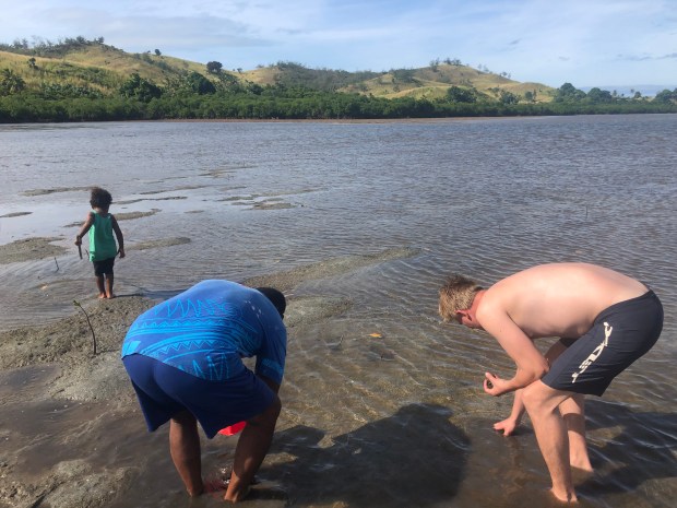 Då hade våra litauiska vänner åkt vidare så vi var själva kvar med familjen. Vi serverades egen lunch med nybakat bröd till, även detta väldigt gott. Efteråt visade Jerry oss hur man letar musslor i lågvattnet intill mangroveskogen och han och Peder plockade en hink full.
