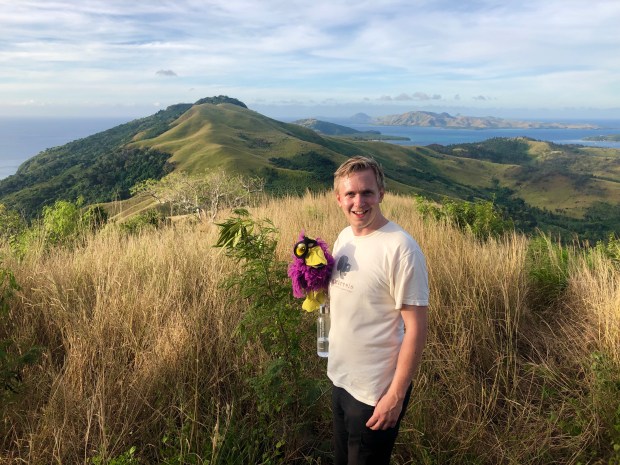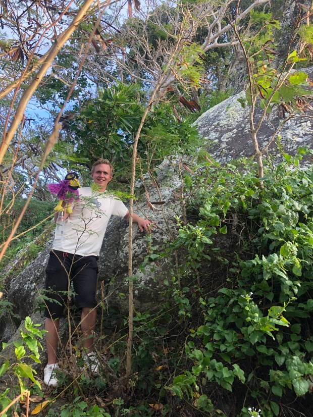Jag var mest betraktare, var inte så pigg på att gräva runt i den varma leran. Sedan duschade vi av oss saltvatten och leta för att sedan ta en promenad upp på öns berg. Det var ett högre berg än det såg ut och hade terräng och tätt gräs som växte högre än vad Peder är.