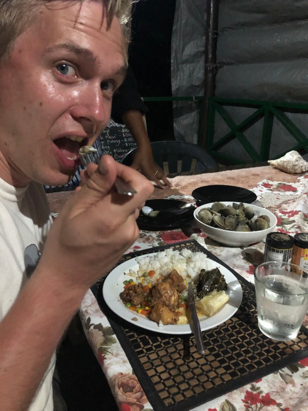 På morgonen åt vi frukost med de litauiska tjejerna innan vår motorbåt kom för att plocka oss för dagens grottbesök. Jerrys fru hade gjort rostat bröd och ställt fram frukt med äggröra, te och kaffe åt oss. Vi längtar dock redan efter någon form av pålägg som inte är sylt.