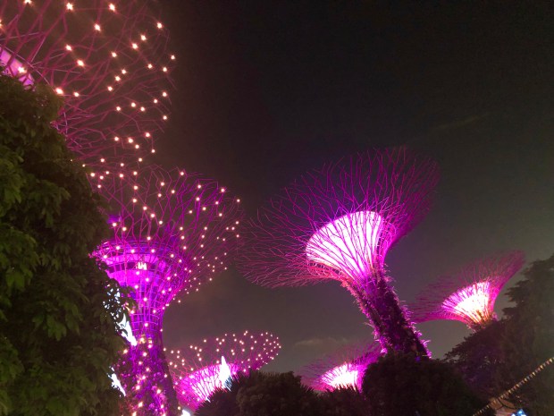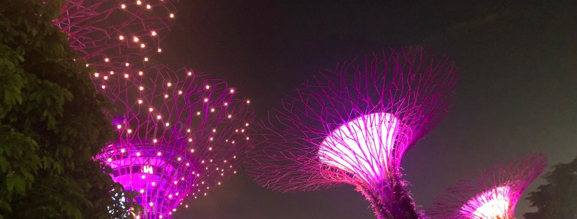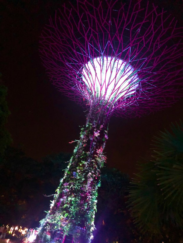 Efteråt gick vi ner framför hotellet och kikade på en gratis lasershow de har ute i viken framför hotellet, med hjälp av diverse olika fontäner. Också svårt att beskriva men fint att se på trots att det avbröts efter ett tag pga ett tekniskt fel. Vi vandrade då vidare över till det kända Gardens by the Bay för att titta på ljusshowen de har varje kväll med hjälp av stora konstgjorde träd (tänk Avatar-filmen).